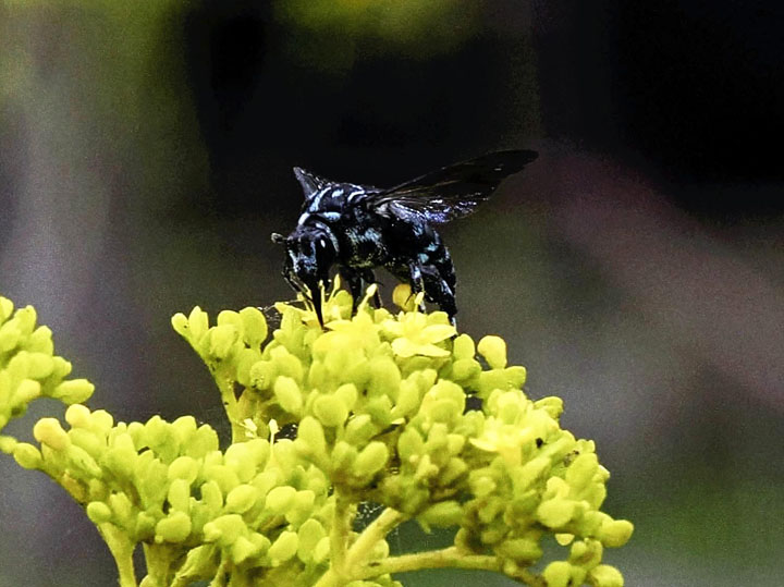 ブルービーは体長1センチほどの希少種で、黒い体に鮮やかな青のまだら模様が入っているのが特徴。平沢さんは花壇に咲く秋の七草オミナエシの所でブルービーを見つけ、撮影に成功した。その日は美しい光沢を持つことから「宝石蜂」と呼ばれるオオセイボウも撮影できたという。