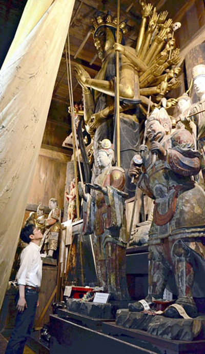 9世紀初頭の作という「立木千手観音菩薩立像(立木観音)」は、名前の通り立ったままの木を彫って作られたという。その左右にはそれぞれ約2メートル、28体の眷属(けんぞく)の像「二十八部衆」が広がる。まさに巨大なステージだ。