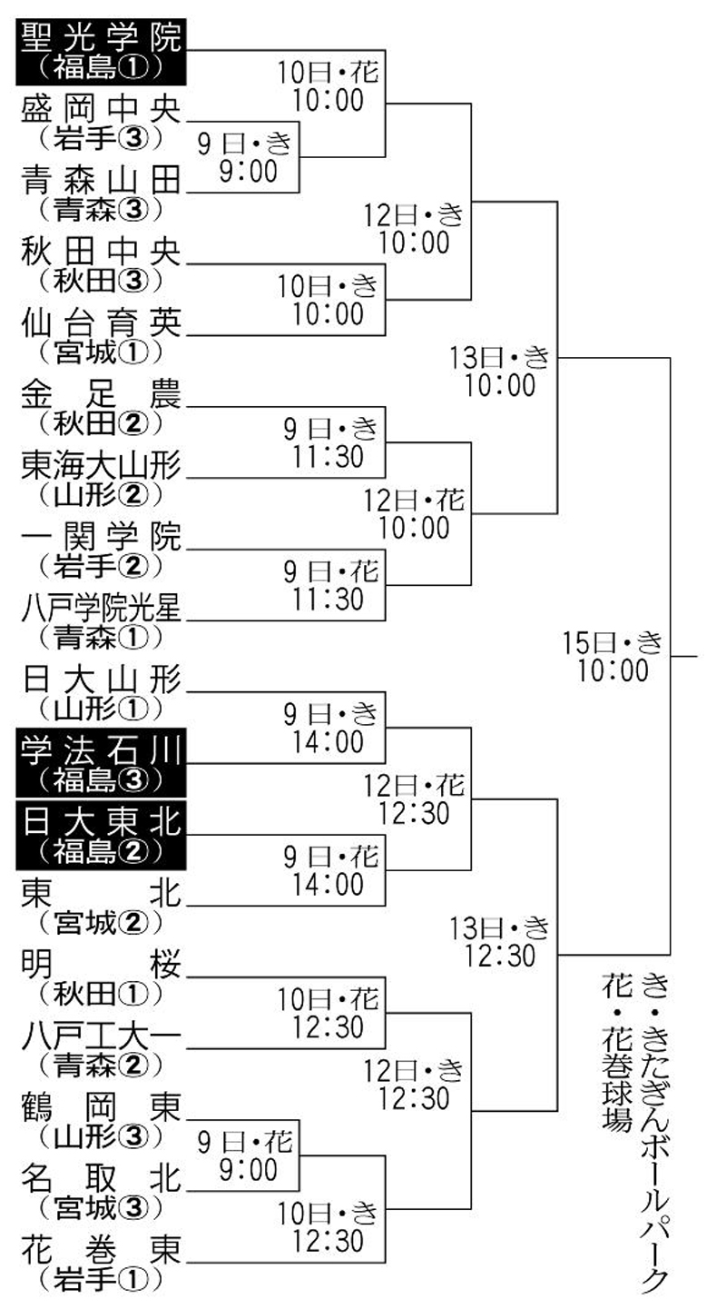 第2代表の日大東北と第3代表の学法石川は、いずれも9日の2回戦第3試合(午後2時開始予定)の初戦に臨む。日大東北は花巻球場で東北(宮城第2代表)と激突。学法石川はきたぎんボールパーク(盛岡市)で日大山形(山形第1代表)と対戦する。