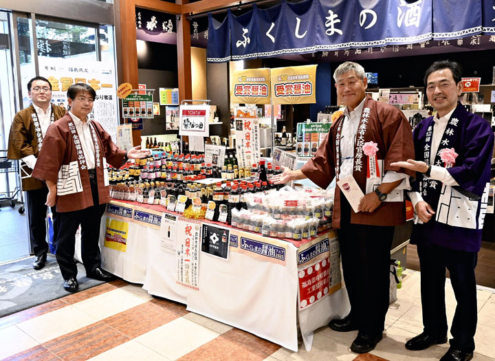 第52回全国醤油(しょうゆ)品評会で5点が入賞した本県のしょうゆをアピールする「ふくしまの醤油フェア」が4日、福島市の県観光物産館で始まった。最高賞の農林水産大臣賞に輝いた山形屋商店(相馬市)の「ヤマブン本醸造特選醤油」など県内25蔵元の38銘柄を販売している。13日まで。