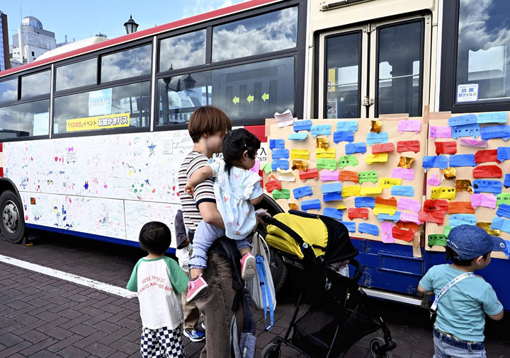 会場には水素バスやサッカーの福島ユナイテッドFCのラッピングバスなど珍しいバスが並び、来場者が乗車したり写真を撮ったりして楽しんだ。バスの車体に絵を描ける「お絵かきバス」も登場し、子どもたちが思い思いに筆を走らせた。