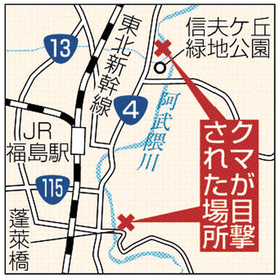 また福島市では、午前3時ごろと同7時20分ごろ、本内字東下釜の松川北側河川敷で1頭ずつ2件、午後3時40分ごろには、小倉寺字白山道の畑で柿の実を食べる1頭が目撃された。松川北側河川敷は国道4号近くで信夫ケ丘緑地公園の向かいにあり、堤防を越えると住宅地や店舗が並ぶ。小倉寺字白山道の畑付近には住宅地があり、警察がパトカーで警戒した。