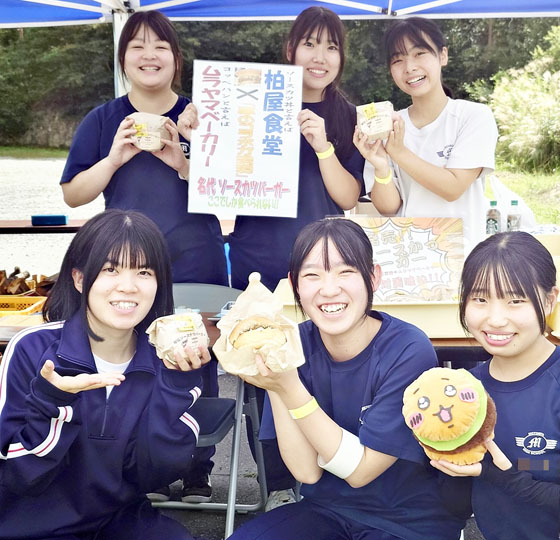 本宮高の生徒は9月27日、本宮市のみんなの原っぱ運動広場で商品開発に取り組んでいる「秘伝ソースかつバーガー」を販売した。多くの来場者が訪れ、約1時間で秘伝ソースかつバーガー65個が完売した。