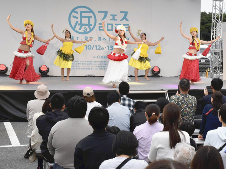 初日のステージではスパリゾートハワイアンズ(いわき市)のフラガールのショーや、お笑いコンビ「テツandトモ」のお笑いライブが繰り広げられた。