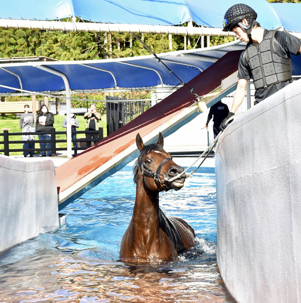 いわき市のJRA競走馬リハビリテーションセンターにある競走馬用のプールは15日、気温の低下に伴いプール納めとなり、リハビリに取り組む馬3頭が今年最後のプールに入った。