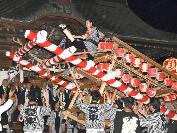 福島市飯坂町の湯野稲荷神社の例大祭は11、12の両日行われ、太鼓屋台が地区を練り歩いた。本祭の12日夜は同神社境内で、激しさで知られる「宮入り」が繰り広げられた。