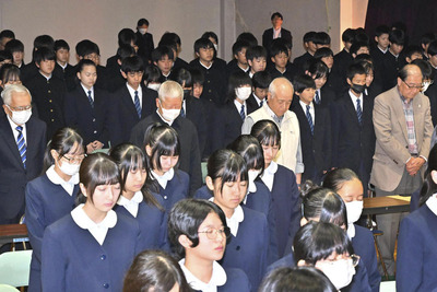 追悼行事に出席し、黙とうする斉藤さん(右)ら同級生
