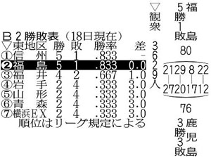 福島は次戦の19日も同会場で鹿児島と対戦する。午後1時35分開始予定。