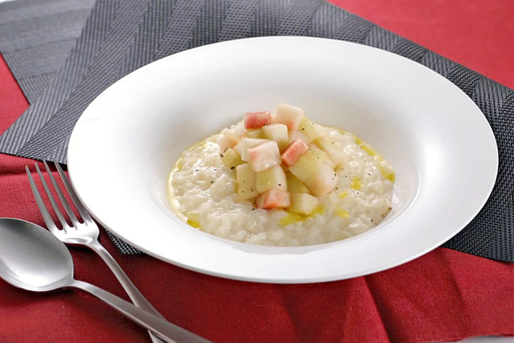 三浦さんの料理は、牛乳、バター、チーズの三つの乳製品を使ったリゾットに、県産の桃がのった一品。果物を合わせる意外性が売りで、食感も楽しんでもらうため、硬めの桃を使う工夫をしたという。