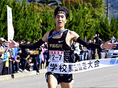 学法石川が大会記録を2分以上縮める圧倒的な走りで15連覇を果たした。5000メートルで13分台の自己ベストを持つ増子陽太(3年)、栗村凌(同)のダブルエースを中心とした有力選手が好走を披露し、2位以下に6分以上の差を付けて県の頂点に立った。 昨年の全国高校駅伝では5位入賞を果たし、現チームは優勝を目標に実力を磨いてきた。この日は増子、栗村が区間新の快走を見せると、2人と共に昨年の都大路を走っ...