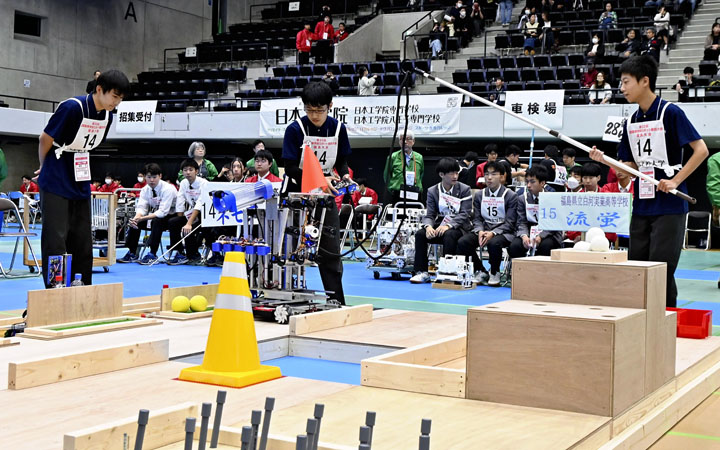 全国高校ロボット競技大会には県勢4チームを含む38都道府県72チームが出場。開発したロボットを使って制限時間にアイテムを所定の位置に置くといった繊細な作業が求められる競技で、動力やボールをつかむアームの仕組みを工夫するなど各チームの技術力が光った。