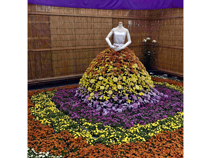 二本松市の霞ケ城公園で11月18日まで開催中の第69回「二本松の菊人形」会場内に、新たにマム(洋菊)であしらったドレス仕立ての菊飾りが登場した。