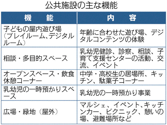 施設の延べ床面積は約2100平方メートルで1階建て。駐車場は約200台分のスペースを確保する。利用料金は施設や駐車場の利用が原則無料、乳幼児の一時預かり事業は有料で検討している。利用開始は2028年5月の予定。