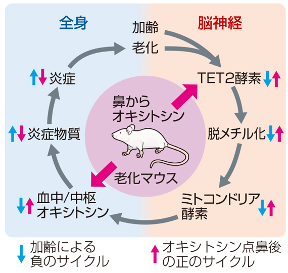 福島医大医学部病態制御薬理医学講座の前島裕子准教授(47)と下村健寿主任教授(53)は、加齢によって減少するホルモン「オキシトシン」が脳の若返りを促進し、全身の老化を抑制するメカニズムを解明した。老化マウスにオキシトシンを点鼻すると、老化の二大要因に働きかけて脳と体の老化現象を劇的に改善することが分かった。研究成果を人に応用できれば、記憶力の低下や身体能力の衰えの改善、加齢に伴う病気のリスク低減...