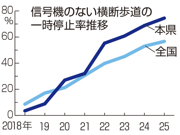 日本自動車連盟(JAF)福島支部は30日、信号機のない横断歩道で車が一時停止する割合「一時停止率」に関して、福島県内の調査結果を発表した。今年は74.5%(前年比5.7ポイント増)と過去最高を更新し、全国平均56.7%を17.8ポイント上回った。全国では6位となり、昨年より順位を二つ上げた。  本県と全国の一時停止率の推移は【グラフ】の通り。本県は2018年から数字を伸ばし、20年から全国平均...