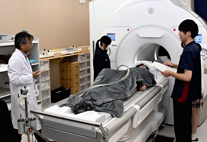 診療放射線科では講義を通してMRI検査の原理などを学び、検査説明からMRI撮像までの流れを体験した。診療放射線技師になりたいという佐々木仁菜(にいな)さん(橘高1年)は「普通はできない体験ができて、いい刺激になった」と話した。