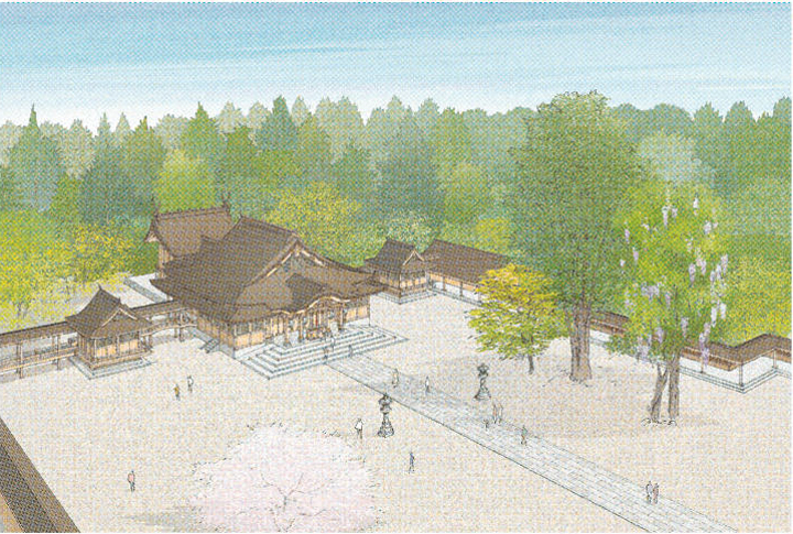 会津美里町の伊佐須美神社は14日、2030年の再建を目指す社殿の完成予想図を示した。新しい社殿は本殿と幣殿、拝殿で構成する。室町時代以降、継承されてきた社殿様式を引き継ぎ、多くの参拝者が昇殿できるよう二重型拝殿とする。拝殿前にスロープを設置してバリアフリー構造とし、積雪対策を取ることなども目指す。