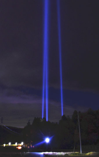 東日本大震災の犠牲者の鎮魂と復興を願うイベント「光のモニュメント」は2日、川内村の長福寺周辺で行われ、夜空に向かってサーチライトが放たれて光の柱が出現した。