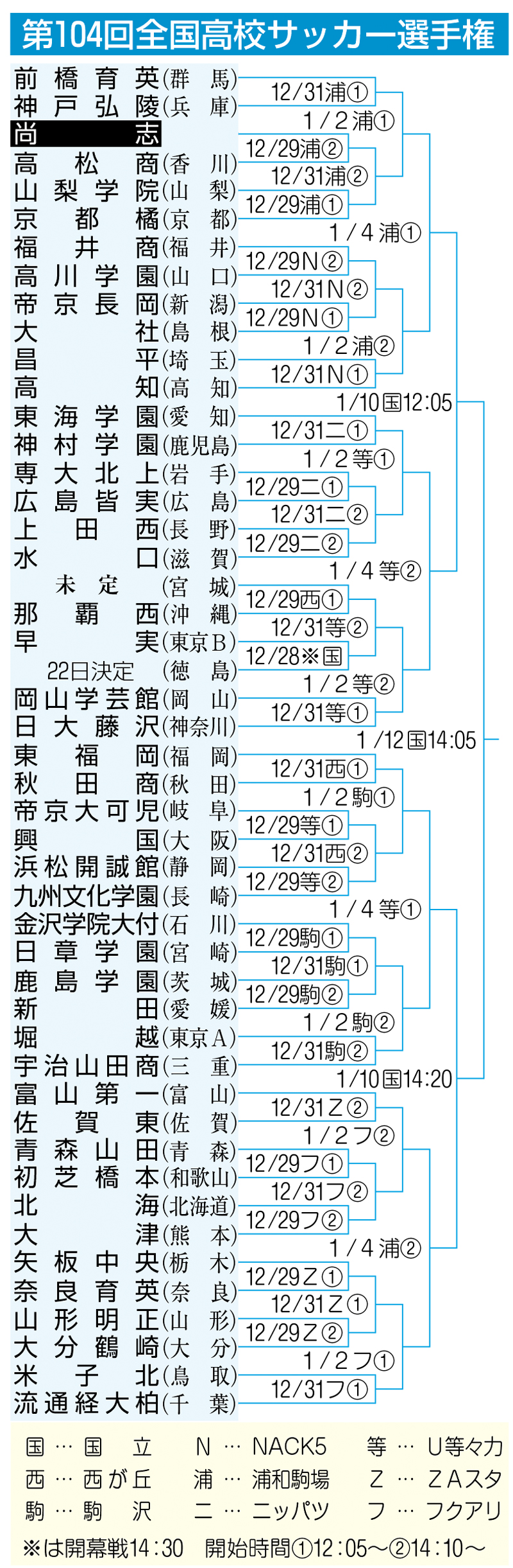 第104回全国高校サッカー選手権(12月28日~来年1月12日)の組み合わせ抽選が17日、東京都内で行われ、福島県代表の尚志は1回戦で高松商(香川)と対戦することが決まった。試合は第2日の12月29日に浦和駒場スタジアム(さいたま市)で行われる。午後2時10分開始予定。