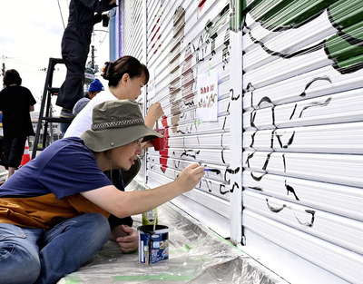 「シャッターに描くのは初めて。凹凸に苦戦したがみんなの協力のおかげで形になった」と関さん。「自分の作品が福島の活性化につながればうれしい。なんでも挑戦するので相談してほしい」と次の作品づくりへ意欲を見せた。