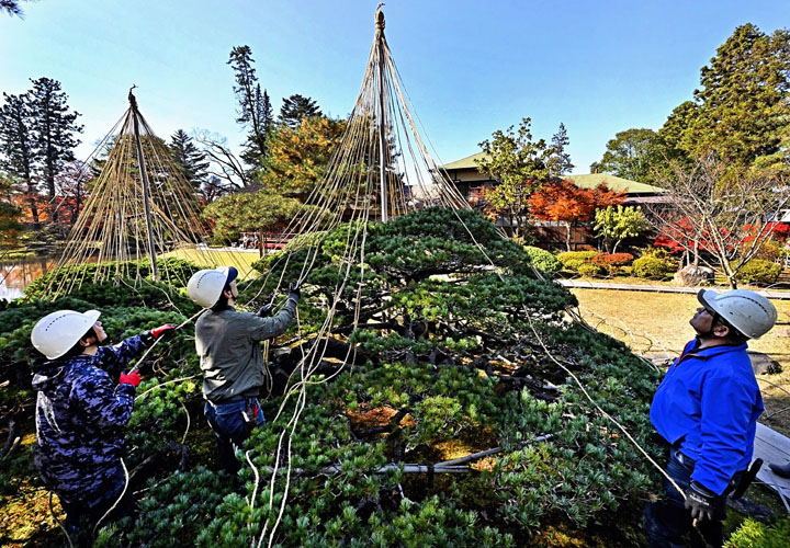 作業は低い庭木に施す雪囲い作業も含めて今月末までに完了させ、本格的な降雪に備える。雪吊りの撤去は降雪や気温状況をみて、来年3月中旬ごろを予定している。