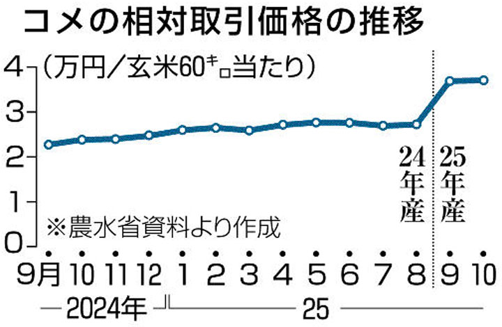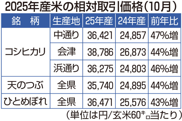 農林水産省は18日、新米の出荷団体と卸売業者が売買する際の「相対取引価格」について、2025年産の10月の全銘柄平均が玄米60キロ当たり3万7058円だったと発表した。過去最高だった9月から163円上昇し、前年同月比では約1.6倍の水準。本県産米は各銘柄とも3万5000円を超え、確認できた08年以降で過去最高値となった。 本県の25年産米の価格は【表】の通り。コシヒカリ・会津産が3万8786...