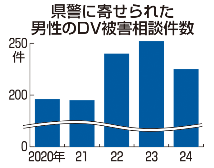 男性がドメスティックバイオレンス(DV)の被害を受けたとして福島県警へ寄せた相談の件数が、近年200件前後で推移している。内閣府の調査では、被害を受けても相談しない人が半数超いるという結果が示された。公的な相談窓口があまり周知されていないこともあり、県内では男性のDV被害者の支援体制が不十分なのが現状だ。