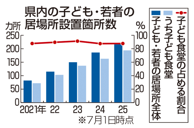 学校や家庭以外で子どもに食事や居場所を提供する「子ども・若者の居場所」の福島県内の設置件数(7月1日現在)が前年同期から35カ所増え、221カ所となった。県が19日、発表した。子ども食堂だけでなく体験活動や学習支援などの居場所も増えており、県は今後も子どもが安心できる居場所の開設を後押しする。  子ども・若者の居場所の設置状況は【グラフ】の通り。221カ所のうち87.8%の194カ所を子ども食...