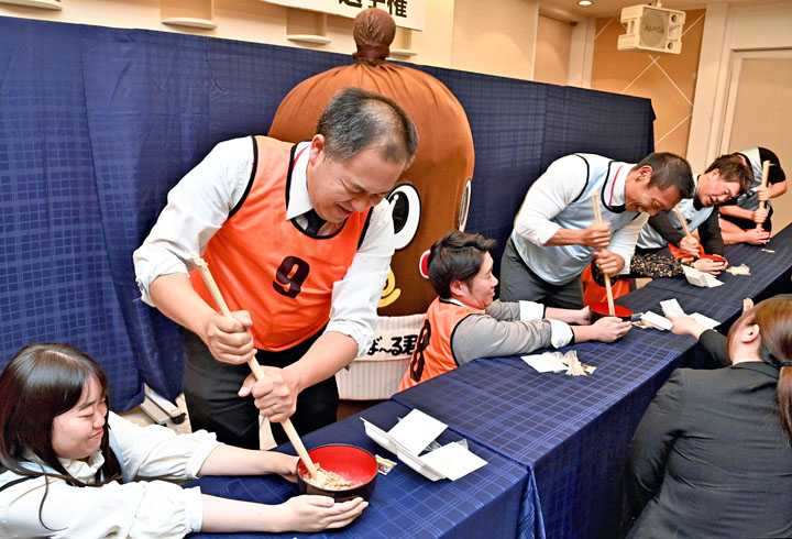 会場では、納豆の混ぜる回数を競う「まぜまぜ選手権」、糸を伸ばして距離を競う「のびのび選手権」も行われ、納豆ファンら県内外の10組が熱戦を繰り広げた。納豆のキャラクター「ねば~る君」も応援した。