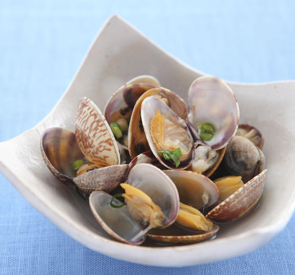 1人分20キロカロリー、塩分0.8グラム(1)2人分で殻付きのアサリ200グラム、青ネギ4グラムを用意します。(2)アサリは塩水(500ccの水に塩大さじ1)に漬けます。アルミホイルなどでふたをして冷暗所に置き、砂出しをした後、殻の汚れを洗い落として水気を切ります。青ネギは小口切りにします。(3)鍋にアサリと酒大さじ1を入れ、ふたをして口が開くまで酒蒸しにします。器に盛り付け、青ネギを散らします。...