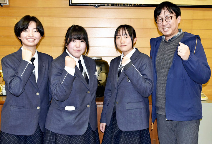 決勝大会に向けて意気込む(左から)折笠さん、石井さん、長嶺さん、中山教諭