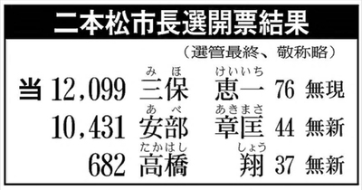任期満了に伴う二本松市長選は30日、投票が行われ、即日開票の結果、無所属で現職の三保恵一氏(76)=4期=が1万2099票を獲得、新人の隠津島神社禰宜(ねぎ)安部章匡氏(44)ら無所属の新人2人を破り、5選を飾った。任期は25日から4年。