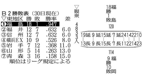 バスケットボール男子Bリーグ2部(B2)東地区の福島ファイヤーボンズは30日、ホームの宝来屋ボンズアリーナで福岡に4度の延長の末、120―114で勝利した。連勝記録は17に伸ばした。通算成績は18勝1敗で東地区首位を維持している。