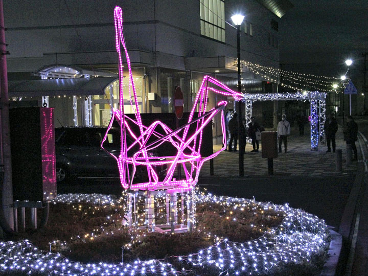 二本松市のあだち観光協会は1日、安達駅イルミネーション点灯式を行った。2年目の今冬は、新たに智恵子像、折り鶴オブジェの足元を彩るなど発光ダイオード(LED)を2千個増やし、東西口合わせて約8千個が輝きを放っている。点灯は午後4時半~同10時。来年2月1日まで。