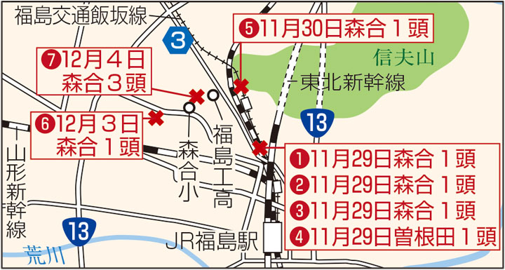 福島市によると、隣接の曽根田を含めて森合地区では11月29日~12月4日、クマの目撃情報が7件寄せられた。列車とクマが衝突する事故も起きている。