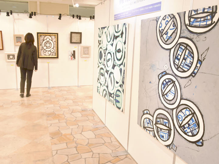 画家としても活躍する俳優国広富之さんの作品展は8日まで、郡山市のうすい百貨店で開かれている。入場無料。「ハイヤーセルフ(高次元に存在する自分自身)」をテーマに描かれた油彩の抽象画を中心に約50点が並んでいる。