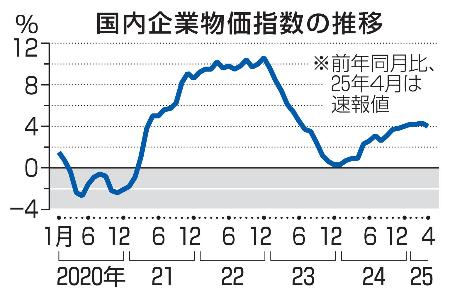 日銀が14日発表した4月の国内企業物価指数(2020年平均=100、速報)は126・3となり、前年同月比4・0%上昇した。コメの値上がりを受け、農林水産物が大幅に伸びたことが指数を押し上げた。伸び率は化学製品や鉄鋼などの市況下落で3月改定値の4・3%から0・3ポイント縮小した。ただ昨年12月以降、4%台での高止まりが続いている。