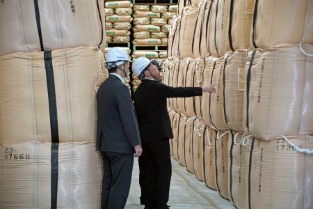 視察では、全国農業協同組合連合会(JA全農)の職員や物流業者と意見交換したほか、備蓄米の管理状況を確認した。