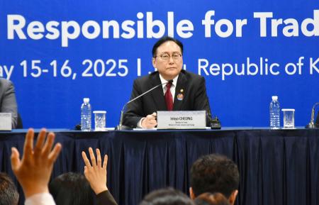 【済州島共同】日本や米国、中国など21の国・地域でつくるアジア太平洋経済協力会議(APEC)の貿易相会合は16日、韓国南部済州島で2日目の協議が行われ、国家間の貿易規則を定める世界貿易機関(WTO)の重要性を確認する共同声明を全会一致で採択し、閉幕した。出席者によると、トランプ米政権の高関税措置に関しても意見が交わされた。