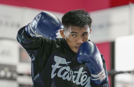 シャドーボクシングやミット打ちで約1時間、たっぷりと汗を流した。重岡銀から9回TKO勝ちでタイトルを奪った昨年7月以来の再戦。「パンチの強さを鍛えてきた。もっと早く倒せるようにベストを尽くしたい」と不敵に言った。