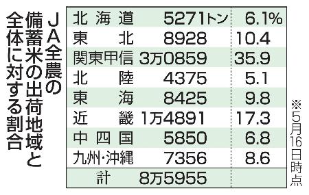 JA全農は備蓄米の大半を落札。3月に落札された計2回のうち、今月16日までに8万5955トンを出荷した。備蓄米倉庫が東北や北海道に集中、西日本への輸送に時間がかかっている。