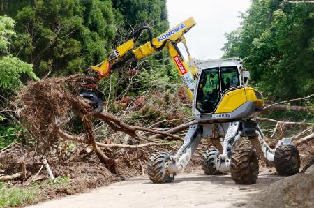 国土交通省能登復興事務所は21日、能登半島地震や記録的豪雨で被災した石川県珠洲市の道路復旧工事で使用している特殊重機「スパイダー」を報道陣に公開した。四つに分かれた脚をクモのように自在に動かせ、斜面でも作業できるのが特徴。実演では、大きな岩を越えたり、倒木を切断して運搬したりした。