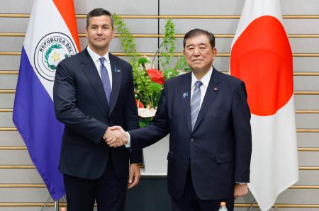 石破茂首相は21日、パラグアイのペニャ大統領と官邸で会談し、両国関係を「戦略的パートナー」に格上げする方針で一致した。日本企業の進出を後押しする投資協定の締結でも大筋合意した。南米で唯一、台湾と外交関係があるパラグアイとの連携強化を図り、台湾に軍事的圧力を強める中国をけん制する狙いがある。