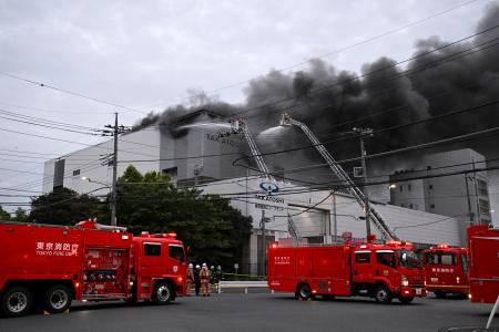東京消防庁によると、消火活動に当たった男性が煙を吸ってけがをしたが、命に別条はない。4階建ての2~4階部分が燃えたとみられる。警視庁によると、産業廃棄物関連の工場といい、出火状況を調べている。