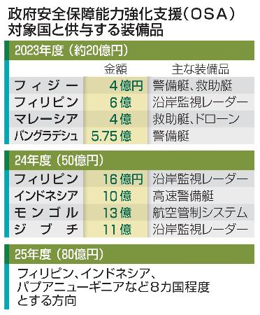 OSAは22年に閣議決定した国家安全保障戦略に基づき、23年4月に創設された。初年度はフィジーを含む4カ国を対象に、総額約20億円を計上。24年度はフィリピンなど4カ国に対し、沿岸監視レーダーなど50億円分の供与を決めた。25年度は対象国を8カ国程度とする方向で、予算は80億円まで増額した。