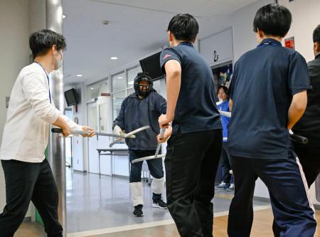 他校も含め約50人の教職員が参加。刃物を持った男が大声を出して廊下に入ってくると、気付いた教員が教室内のブザーで異常を知らせ、5人以上が教室から刺股を持って駆け付けた。荒川真一校長(51)は「事件から時間はたっても、訓練を通して学校安全に対する知見を継承していきたい」と話した。