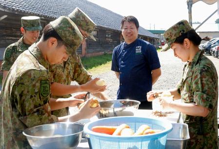 陸上自衛隊第14普通科連隊(金沢市)は28日、昨年の能登半島地震や記録的豪雨の際にボランティアとして炊き出しをした石川県輪島市の日本料理店店主冨成寿明さん(42)を金沢駐屯地に招き、炊事訓練を実施した。調理や衛生管理の能力向上が目的。冨成さんは健康に配慮したレシピや、素材本来の甘みを引き出す工夫などを紹介した。