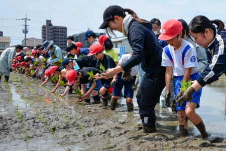 2011年の東日本大震災で津波被害に遭った岩手県大槌町ゆかりの「奇跡の復興米(大槌安渡ひとめぼれ)」の田植えが2日、大阪府富田林市で行われた。地元小学校の児童約60人と、農協や市の職員がはだしで田んぼに入り、泥に足を取られながらも10センチほどの苗を丁寧に植えていった。