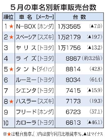 5月の車名別国内新車販売台数は、ホンダの軽自動車「N―BOX(エヌボックス)」が前年同月比7・0%減の1万3565台で、2カ月ぶりに首位になった。日本自動車販売協会連合会と全国軽自動車協会連合会が5日発表した。