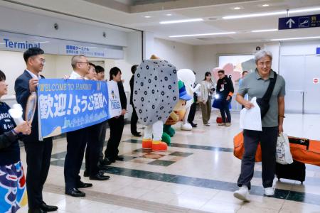 函館空港では5日午後に第1便が到着、大泉潤市長らが出迎えた。ソウルから観光で来た李碩遠さん(31)は「船を見て海鮮を食べるのが楽しみ」と目を輝かせた。
